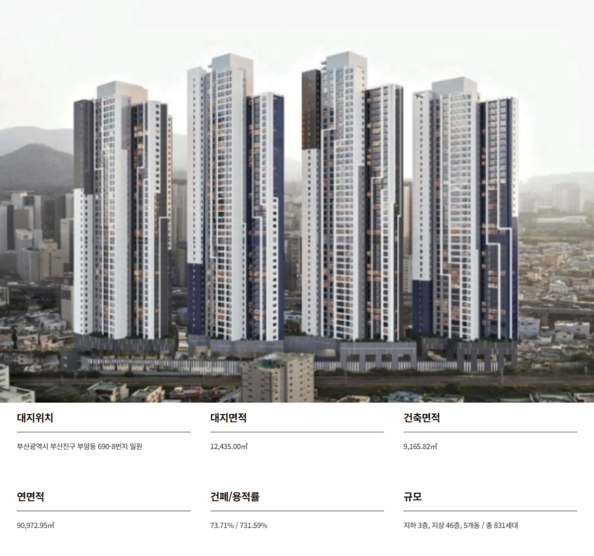 태영건설 데시앙 브랜드 믿음직한 1군 건설사의 명품 주거 가치 높은 신뢰도를 자랑하는 태영건설 데시앙의 뛰어난 시공 기술과 프리미엄 주거 철학이 담긴 단지입니다. 규모/구성: 최고 46층, 5개 동 아파트(762세대)와 오피스텔(69실) 복합 구성 지상 최고 46층 높이의 5개 동으로 이루어져 있으며, 주거와 상업 기능이 결합된 대규모 복합단지입니다. 교통: 2호선 부암역 초역세권 단지 바로 앞 약 50m의 압도적 접근성 부산지하철 2호선 부암역 출입구가 단지에서 약 50m 거리에 위치한 진정한 의미의 초역세권을 실현합니다. 설계 특화: 3~4Bay 혁신 평면 채광과 통풍을 극대화한 구조 선호도 높은 3~4Bay 설계와 효율적인 수납 특화 공간 제공으로 쾌적하고 넓은 실사용 공간을 누릴 수 있습니다. 안심 도보 통학 환경 단지 인근 유치원 및 초등학교 근접 성인 초등학교 등 교육 시설이 인접해 있어 자녀들이 안전하고 편리하게 통학할 수 있는 학군입니다. 부산 도심 희소 평지 입지 경사 없는 편리한 보행 환경 부산의 지형적 특성상 희소한 평지에 자리 잡아 세대 내부뿐 아니라 단지 외부 이동까지 편리합니다. 원스톱 메디컬/상업 시설 서면 중심의 완성된 인프라 단지 내 상업 시설은 물론, 서면의 다양한 의료, 금융, 쇼핑 시설을 빠르게 이용할 수 있는 편리한 환경입니다.